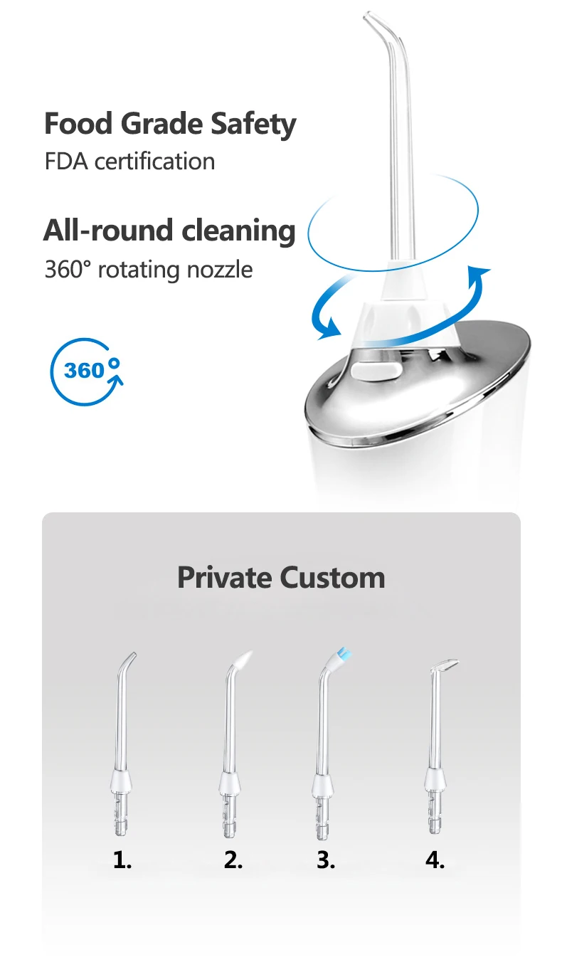 Using 1200-1800 beats/min high-pressure pulse water flow to wash away the teeth,under the gingival cavities and other concealed parts,eliminate the oral cavity odor,bring unusual freash feeling